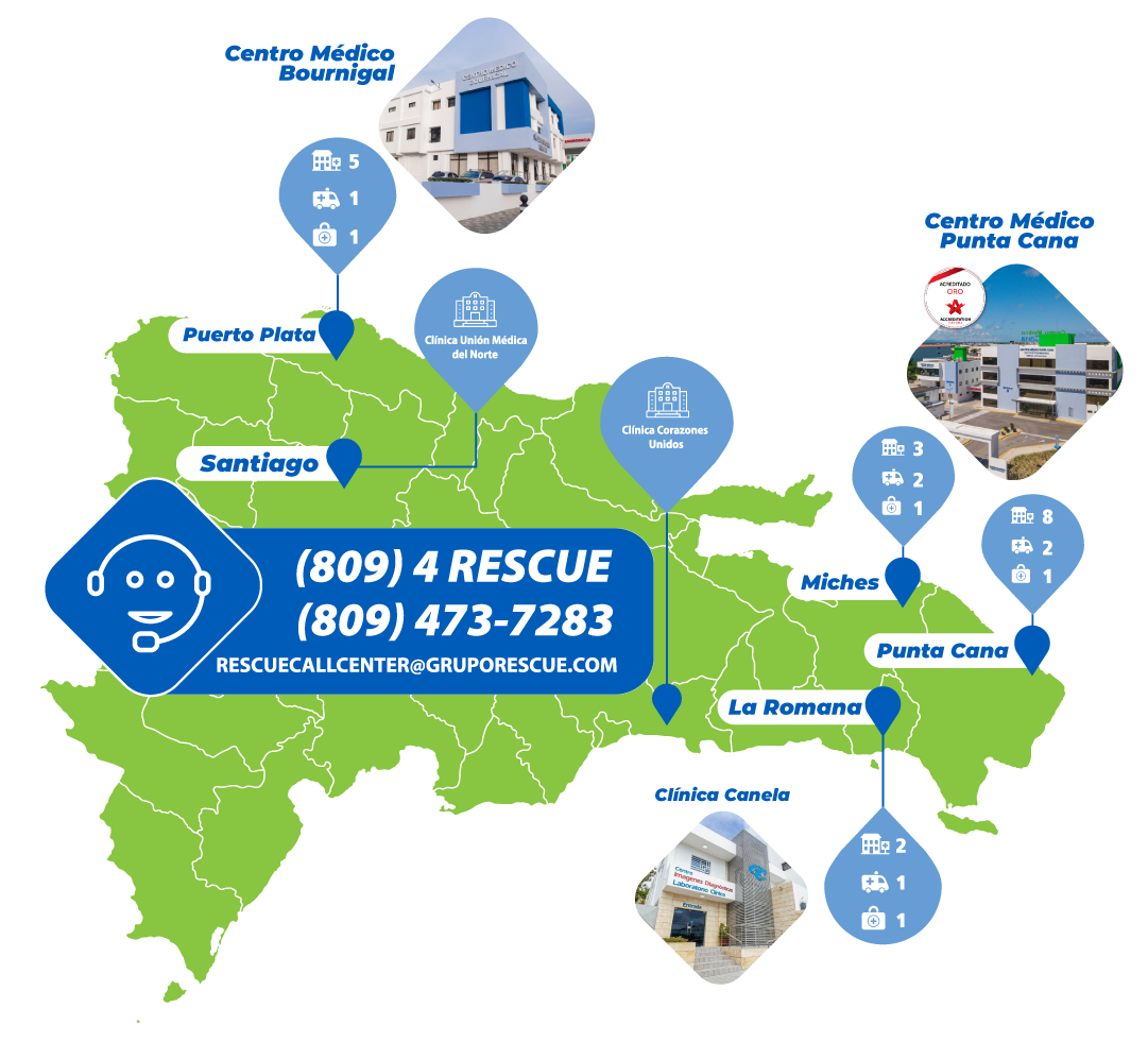 La red nacional de servicios médicos Grupo Rescue Cuenta con más de 40 años de servicio, la misma nació cuando un grupo de centros del ramo de la salud, decidió unir esfuerzos, para mejorar la atención médica al mercado turístico en la República Dominicana.